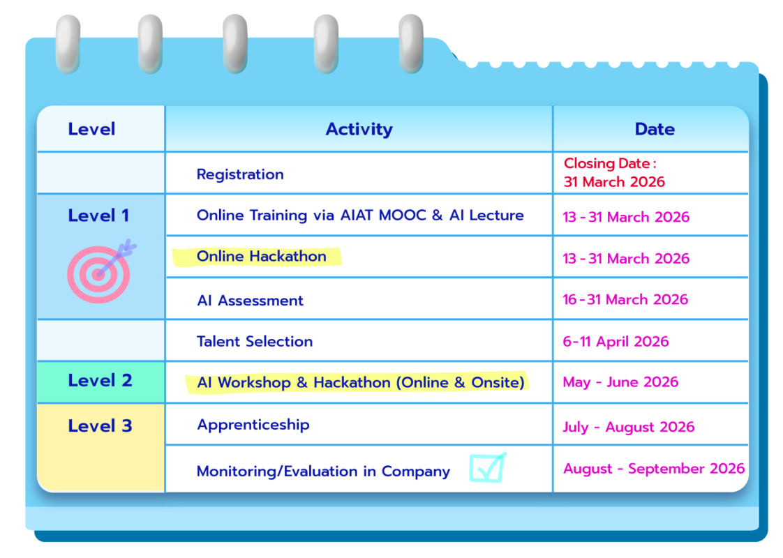| Level 1 | Online Training via AIAT MOOC & AI Lecture | 13 – 31 March 2026 |